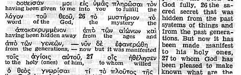 Jehovah's Witnesses do not like to hear the term " mystery" in connection with God, as they claim God is no mystery to them! However, the Kingdom Interlinear Translation, shows the word "mystery" under the Greek word when referring to a previous "mystery" now known to the Holy Ones. Note carefully Colossians 1:26. where the word "mystery" appears under the Greek text but in the English column of the New World Translation the word "mystery" has been changed to read "sacred secret". Why?