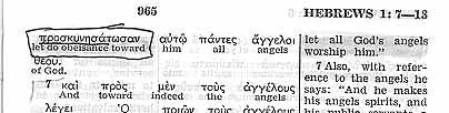 What happened to their promise to assign one meaning to one word and stick with it? Apparently this only works when it is not exposing their false teachings! You see, if they abided by their stated rules and told the truth that Jesus was worshiped, that would be an admission that he is God, and not "a god" as they teach. Oh, what a tangled web they weave! The Watchtower's invented term "did obeisance" was given a definition by them, namely, "...act of bowing, kneeling, prostrating the body, or making some other gesture to betoken submission; or simply the paying of respect. It adequately translates the Hebrew hishta-chawah' and the Greek pro-sky-ne'o in many cases." (Insight on the Scriptures, Vol. 2, page 523). Trouble is, they have no backing by Greek scholars for this invented definition. Second problem for them is that many dictionaries list "obeisance" as a definition of "worship"! Sometimes the Society just can't keep their deceptions straight with each other! Such an example is Hebrews 1:6 in the Purple KIT. Here they put "obeisance" on the Greek/English side and "worship" on the NWT side! What a hoot! If you're going to mistranslate, at least try to be consistent! They had to scramble around and correct their boo-boo in the 1985 navy-blue edition where they hastily did away with the worship of Jesus.