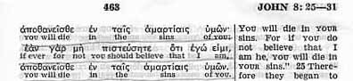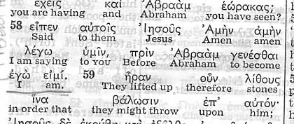 Why do they "translate" the words "ego eimi"as "I have been" in this verse (John 8:58), when, if you turn back two pages to John 8:18, 23, 24 and 28 you will see examples where "ego eimi" is translated correctly by them, as "I am". Even in the English text under the Greek text (KIT) these same words are translated as "I am" in John 8:58 but they have been CHANGED in the New World Translation. Why? What happened to their promises of a correct word-for-word translation, with no paraphrases? Why the deception on this verse, with its subsequent cover-up, not once, but three times? Why have they changed the plain statement by Jesus Christ that He is the "I Am"? Every honest-hearted Jehovah's Witness needs to know the answer to this question. Numerous translations and Bible scholars correctly cross-reference this verse with Exodus 3:14 which reveals the divine name for God as "I AM". The Watchtower Society could not have its followers believing the revealing words of Jesus over their false doctrine. Jesus really is the "I AM". The Ryrie Study Bible (New American Standard Version) has this comment in the footnote for John 8:58, "The "I AM" denotes absolute eternal existence, not simply existence prior to Abraham. It is a claim to be Yahweh of the O.T. That the Jews understood the significance of this claim is clear from their reaction (v.59) to the supposed blasphemy." Truly, Jesus took the Divine Name of God and applied it to Himself! The Watchtower "translators" had to mistranslate, and misconstrue Greek tenses to hide this fact. How important is this? Jesus, Himself tells us just how important it is. He tells us in John 8:24 that unless we believe that He is the "I AM", we will die in our sins! ![]()