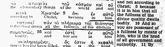 "divine quality"?? Where is that found in the Greek! Nowhere! It is a Watchtower invention. In the KIT, under the Greek text, in the purple edition (1969) , the word is translated "godship" (Wescott & Hort's correct translation) but in the navy blue edition (1985) the same Greek word becomes "divinity". How dare they take the liberty of altering Greek meanings from edition to edition, when they have no Greek Scholars? Why could they not just "translate" from the KIT (purple edition, for example) and have the NWT read closer to the English under the Greek text, such as "because in him is dwelling down all the fullness of the godship bodily." The impact of this scripture is momentous--all the fullness of the godship makes Christ truly God, and lest we think He was something less in the flesh, this scripture says he was fully God even in the flesh! Biblical truth, but not Watchtower "truth", so once again the WT doctrines took precedence over the Word of God. Shame on them!