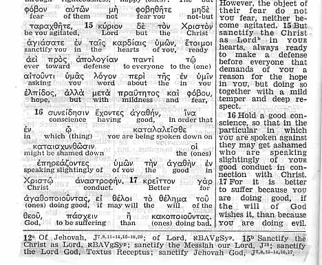 1 Peter 3:15 (footnote) (19) Let's therefore read it as written, according to the footnote: "But sanctify the Christ as Jehovah God in YOUR hearts". Oh my! The Watchtower translators couldn't very well have their followers sanctifying Christ as Jehovah could they? Nor could they entertain the idea that Christ could be in their individual hearts as Jehovah God. Therefore they mistranslated, breaking all their own rules, to hide this important truth.